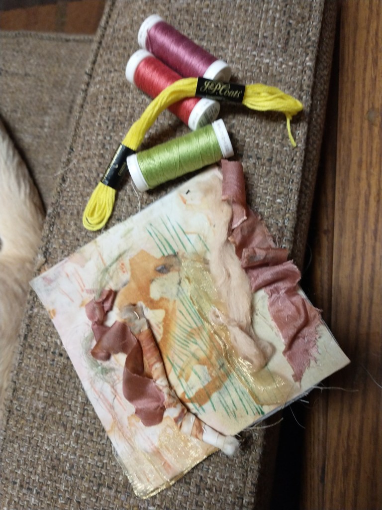 These are really fun to make, but I have to be careful to not give myself too much work with this 100-collage challenge. I am trying to finish 2 collages per week, so they can’t be too involved or I end up going beyond my self-imposed deadlines. I have limited my size to 5×5 inches just for this purpose, but I could sit and stitch for a long time and at some point I have to put things down and go on to the next thing. The challenge is good though, I’m learning a lot along the way.