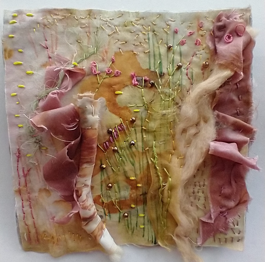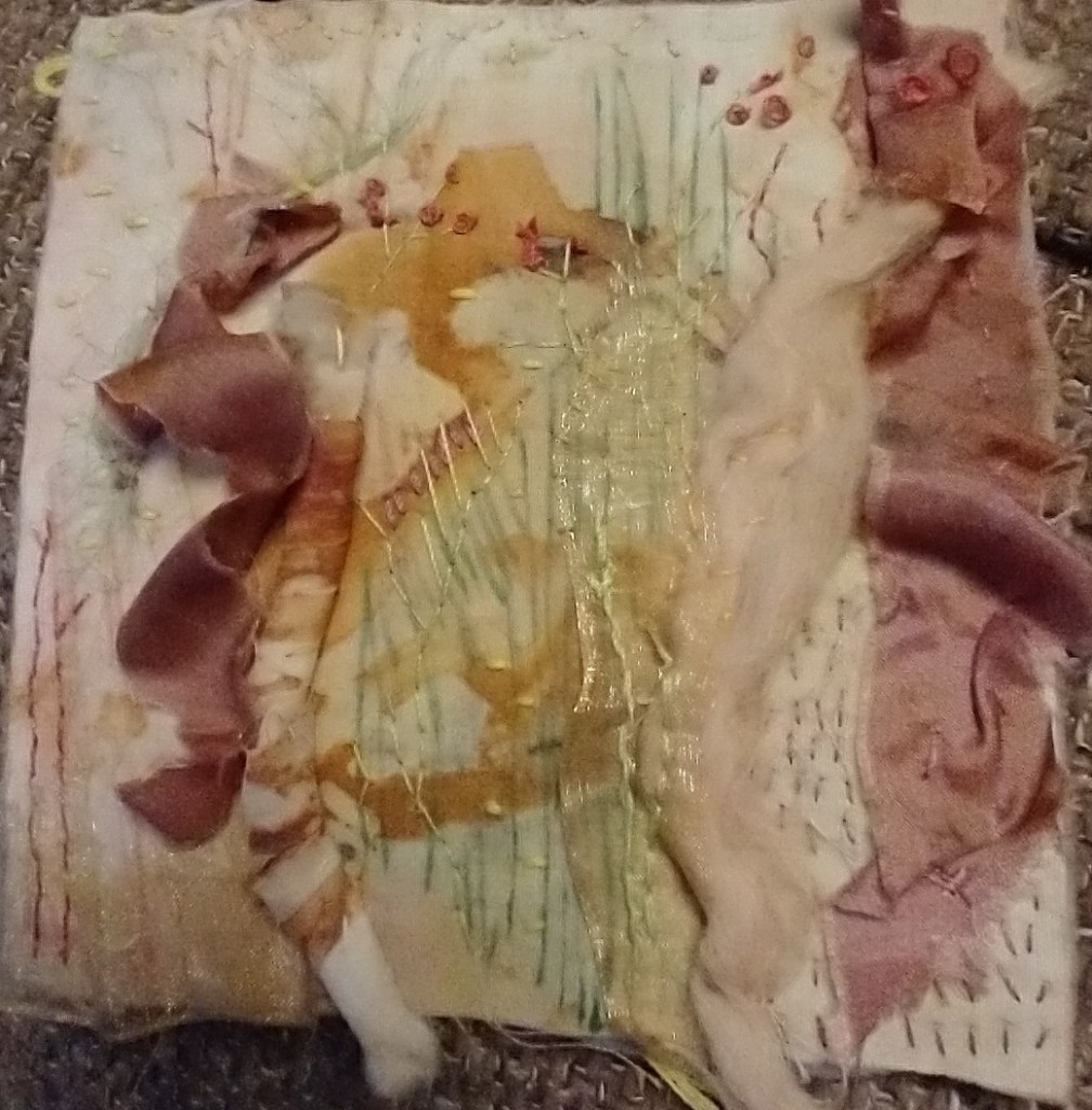 I used the different threads to help enhance the fabric embellishments I had placed already, and also the drawn marks. It isn’t really meant to depict anything, more of an abstract piece, but it turned into a bit of a landscape. I am learning that I need to work on my photos too, the light in my house is not ideal. That is what this process is for, to keep learning things.
