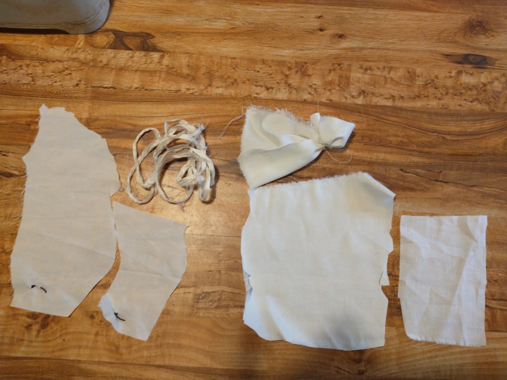 I took some samples of fabric to dye – the left is some mystery fabric – I think maybe a silk blend or some kind of synthetic. It took ecoprinting really well, but that doesn’t actually tell me what it is. It’s a nice, light but luxurious fabric. I think it’s a silk blend maybe. I stitched some black embroidery thread into it to mark it. Then I have some silk sari ribbon, and then two pieces of actual silk that I bought. The top one I stitched a little to try to get a shibori look. The piece on the far right is cotton. I did not treat any of the fabric prior to doing the indigo dyeing.
