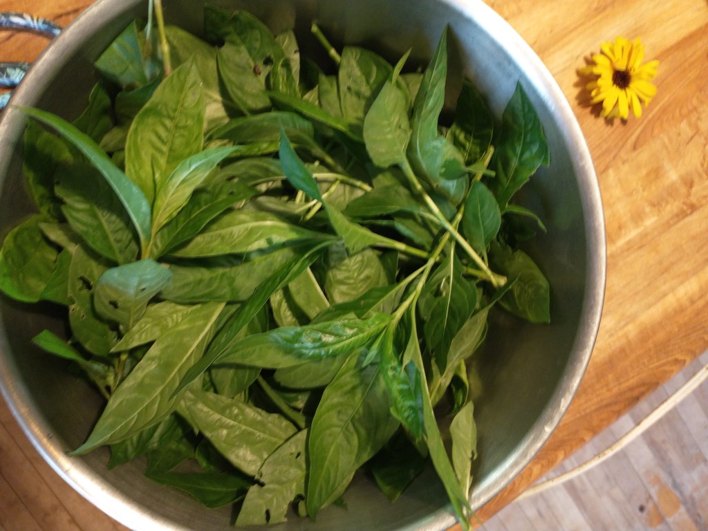 I’ve been growing indigo to use in natural dye projects. It’s growing well, about a foot tall. and I had to figure out when to harvest it. I searched online and found I could use it right now, just harvesting the leaves. You need to harvest the leaves before it flowers, and you just cut what you need and leave the plants to keep growing.