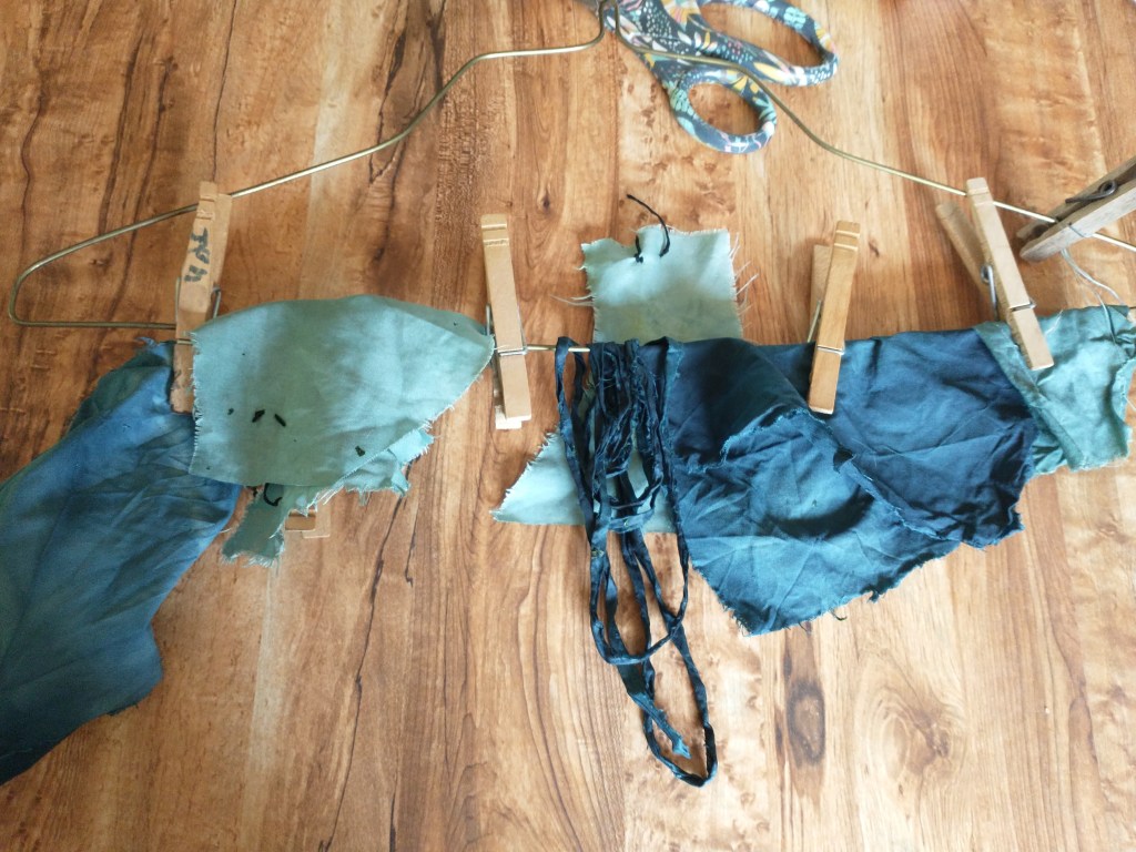 I was still in the process of drying them but wanted to take pictures. My known-silk pieces dyed the darkest. The mystery fabrics were a lighter teal color, about the same as the cotton. Pretty good for a quick experiment in natural dyeing. Now I plan to use these in some of my textile collage projects.